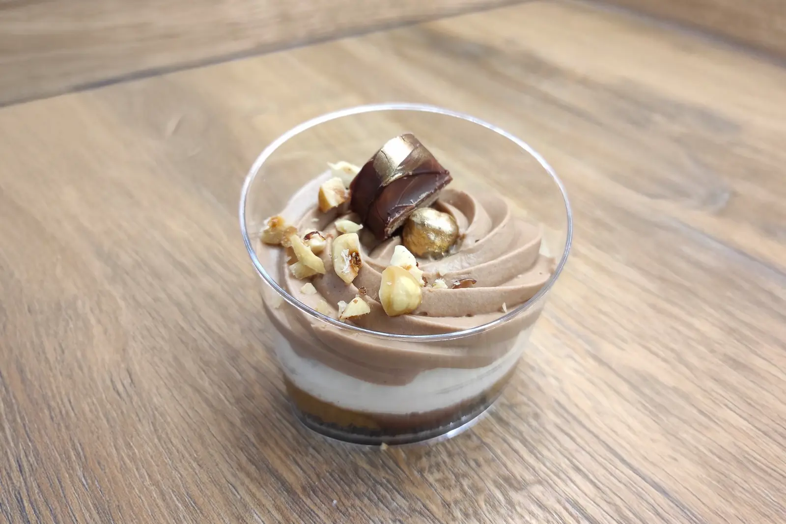 warstwa ciasteczkowa, krem czekoladowo-orzechowy, pralina z orzechów laskowych i migdałów oraz krem waniliowy chantilly